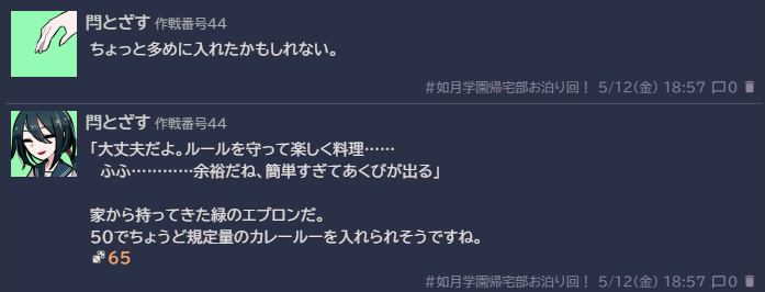 帰宅部部室、胡乱な存在の割に居る人がみんな上手いのでいい具合にラノベっぽくてめちゃめちゃ助かっています。あとこう、この手の部室って参加者以外お断りかも……といつも怯えてるんですが、実は主催してみると案外誰が来てもわーい!人だ!やったー!になるな……と感じています。外と中では見えるものが違うというわけだね……