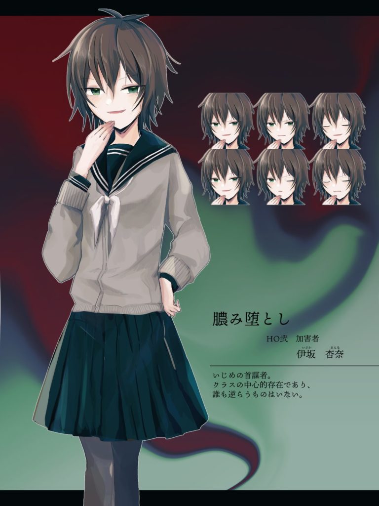 精神を病んだ女子高生と、お人好しな刀のコンビ。表向きはヤバい刀に乗っ取られた大人しくて可哀そうな女子高生……という見た目になるように作っていました。こういう乗っ取りや同一性の崩壊を好んでいるんですが、乗っ取った側が困っているパターンってなかなかやらないので面白いんじゃないか?という目論見でした。