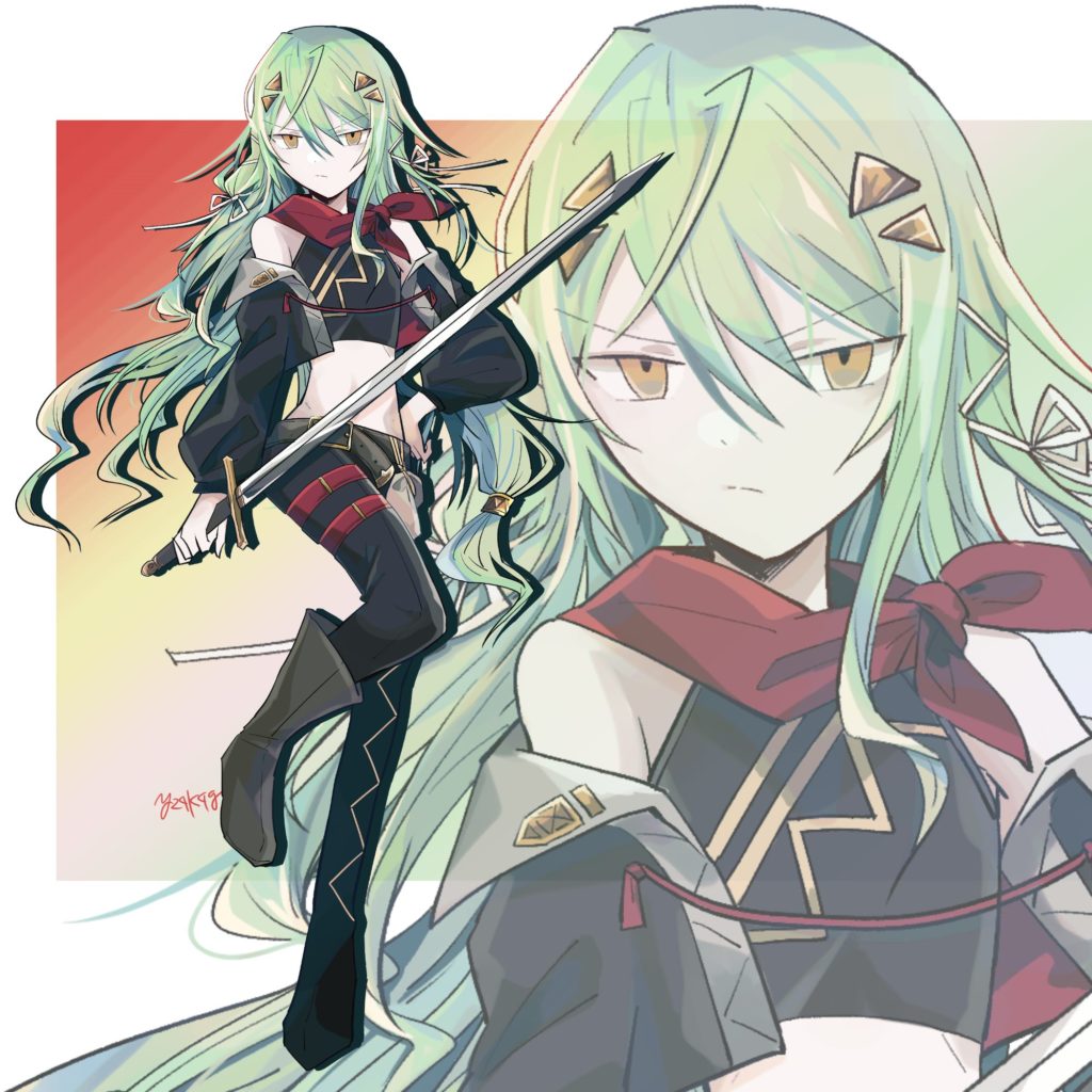 生意気なクソガキ、孤児で腹違いの兄のことがめちゃくちゃ嫌い、という犬猿をするために生まれてきたような女。崩壊シリーズで緑髪の魅力をこれでもかとブチ当てられまくり、無事に緑髪を描くことに……結構スケベな服になってしまったけど本人は気にしてなさそうなところがお気に入りだったりします。