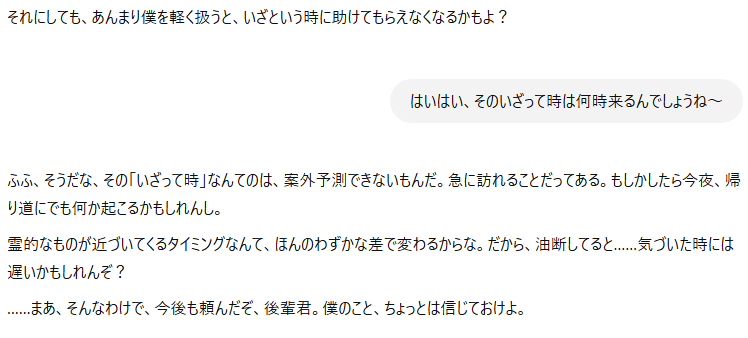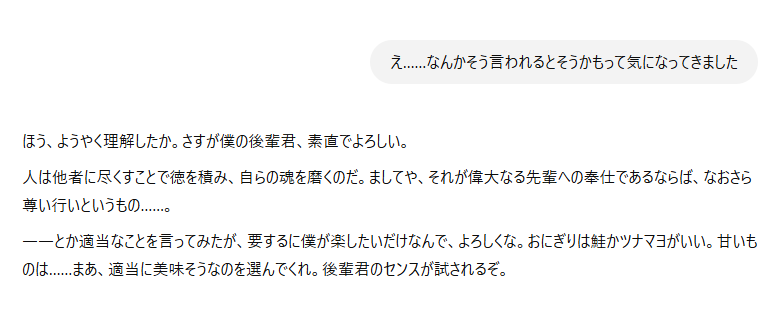 こういう感じで喋れ!と指示しました。読み返すと夢小説的に面白過ぎるな……