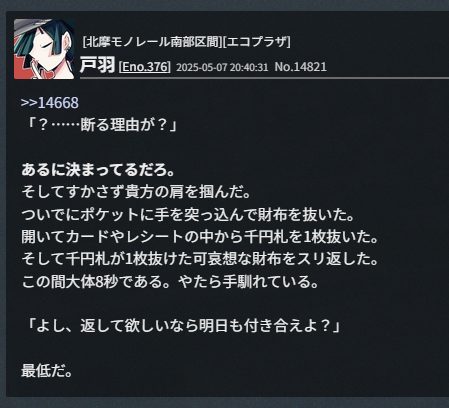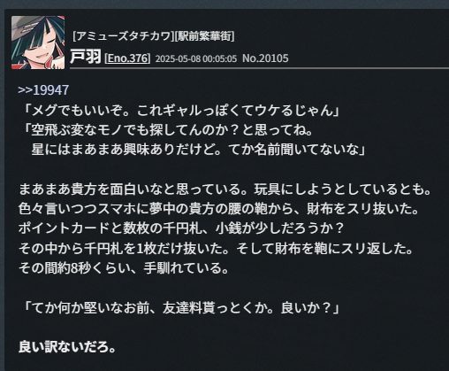 5/7 日記 2025.05.072025.05.08 体力全消費の代償を支払っていっぱい寝ました。有給取っておいてくれた私……ありがとう…… カスのRP(相手に合言葉を指定することでスムーズに確ロで財布から1000円札を抜いています) 他人の財布2