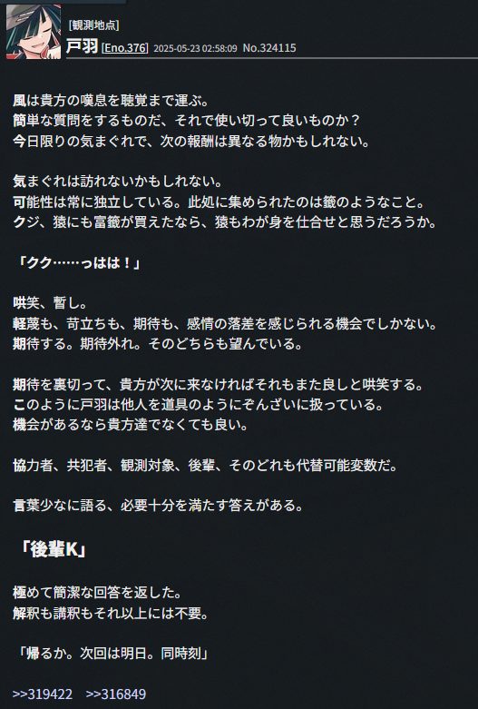 5/23 日記 2025.05.23 うおおおお~~~~~昨日は凄いレスしちゃったな。激しいレスでした。 激しいレス、その一例。 これは最初の行が全部か行で始まっています。 猿にも富籤が~の流れはファウストのメフィストフェレスの言葉から引用。 ナンパに成功してしまった……