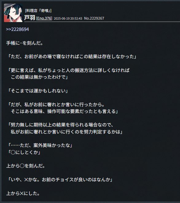 金額は予想以上に高かったのではないかなと思います。食品をしっかり処理してくれるヘンな食べものの店ってファミレスよりはるかに上位ですからね。ファミレスと同等かより上位、とは言っていますが戸羽はファミレスちょい上くらいを想定し、そのスケールに収まる範疇を期待していたと思います。運が良い状態とは努力無しに期待以上の結果とは言っていますが、スケールをオーバーする場合は運が悪い扱いになるのだと思います。